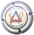 Cristian Senez | rosé et or 173-2-1 /204-1-5 | fond or rosé, contour strié or rosé et bleu, inscription bleue "Champagne Fontette", triangle triple contour bleu, une lune rouge à gauche et un soleil rouge à droite, une inscription rouge traversant le dessin "Senez" |