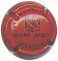 Severin-Doublet | rouge 173-2-6 /204-2-6 | fond rouge, inscription noire "Champagne - Severin-Doublet - Vertus", blason central haut partie gauche armes de champagne, partie droite coeur transpersé d'une flêche, armes de Vertus |