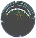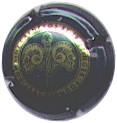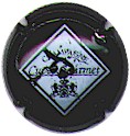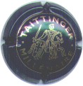 Taittinger | noir et or - petit dessin lettres dbles (56) | fond noir, cercle or, inscriptions or doubles lettres "Taittinger - Reims", petit dessin cheval et cavalier avec épée or et noir, cercle or bordé de noir |