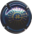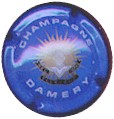 J. de Telmont | bleu 177-2-4 / 209-2-2 | fond bleu, inscription blanche "Champagne Damery", motif central blanc représentant un heaume de chevalier sur un fond soleil brillant or, devise or sur noir "Nec Pluribus Impar" |