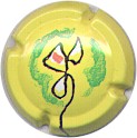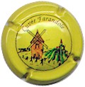 Thibaut | farandole, jaune polychrome 178-1-6 (NR) /(NR) | fond jaune, cercle noir, inscription noire manuscrite "Cuvée Farandole", motif central polychrome représentant un moulin orange et marron, dominant un champ de vigne vert, et au fond un village avec un clocher d'église, en avant-plan, des enfants en noir dansent une farandole sur une route |
