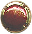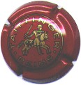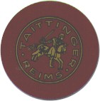 Taittinger | bordeaux et or - petit dessin 67) | fond bordeaux, cercle or, inscription or "Taittinger - Reims", petit dessin cheval et cavalier avec épée or et noir, cercle or bordé de noir |