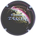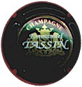 Emmanuel Tassin | marron 177-1-6 / 209-1-2 | fond marron, double cercle or, inscription or "Champagne - Celles-sur-Ource", blason central or armes de champagne, entouré de 2 lions, surmonté d'une couronne, traversé d'une inscription blanche manuscrite "Emmanuel Tassin", légendé "Trade Wine" |