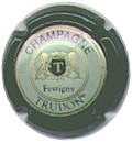 Trudon | vert 181-1-3 /213-2-5 | contour vert foncé, double cercle or, inscription verte "Champagne Trudon", double cercle or, blason central or et marron contenant l'initiales "T" or sur fond marron, entouré de 2 lions, surmonté d'une couronne et souligné par l'inscription verte "Festigny" |