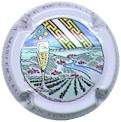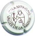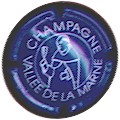 Vallée de la Marne | Polychrome, contour blanc, écriture noire sur contour 181-2-4 /214-2-3 | contour blanc contenant l'inscription noire "Vallée de la Marne - Grand Vin de Champagne", cercle noir, fond central champs de vignes verts avec villages à toits rouges, ciel bleu traversé par le blason de Champagne jaune et blanc, une coupe de Champagne pleine en premier plan |