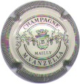 M. Vanzella | crème et noir 182-2-1 / 215-2-2 | contour crème strié noir, fond crème, cartouche haut et bas contenant les inscriptions noires "Champagne" et "M. Vanzella", motif central noir avec blason contenant les initiales enlacées "MV" entouré de branches de vignes |
