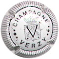 Verzy | blanc et noir 185-1-1 | contour strié blanc et noir, fond blanc, inscription noire "Champagne Verzy", les 2 mots étant séparés par 3 bulles noires, blason central noir contenant 2 comètes allant de bas en haut, et une grande initiale noire "V", surmonté de remparts avec 3 tours crénelés |