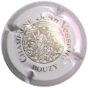Jean Vesselle | blanc 185-1-3 /218-1-2 | fond blanc, inscription or "Champagne Jean vesselle - Bouzy", cercle or, motif central or représentant un moine au milieu des vignes, avec un ruban portant l'inscription "Champagne Jean Vesselle - Bouzy" |