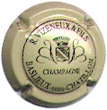 R. Vizenieux et Fils | crème et noir 187-1-5 | fond crème, cercle noir, inscription noire "R. Vizenieux & Fils - Baslieux sous Chatillon - Champagne", blason central avec armoiries de Champagne, surmonté d'une couronne, entouré de brindilles |
